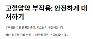 - 기침이 계속된다면: 특히 밤에 심해지는 '마른기침'은 특정 혈압약(ACE 억제제)의 전형적인 부작용입니다. 의사와 상담하면 다른 계열(ARB)로 쉽게 바꿀 수 있습니다.