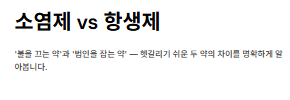 - 소염제는 염증과 통증을 줄여주는 약이고, 항생제는 세균을 죽이는 약입니다.