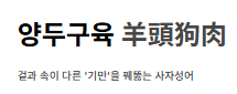 직역: 가게 문 앞에는 맛있는 양머리를 걸어두고 손님을 모으지만, 실제로 안에서 파는 것은 질이 낮은 개고기라는 뜻입니다.