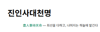 진인사대천명(盡人事待天命)은 인간으로서 할 수 있는 최선을 다한 뒤에, 그 결과는 하늘의 뜻에 맡기고 겸허히 기다린다는 뜻의 사자성어입니다.