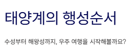 태양을 기점으로 가장 가까운 곳부터 먼 곳까지의 태양계의 행성순서는 다음과 같습니다. 앞 글자만 딴 '수금지화목토천해'로 외우면 기억하기 매우 쉽습니다.