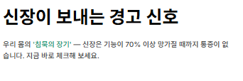 신장은 우리 몸의 노폐물을 걸러주는 '정수기' 역할을 합니다. 하지만 기능이 70% 이상 망가질 때까지 특별한 통증이 없는 경우가 많아 '침묵의 장기'라고도 불리죠. 신장이 안좋으면 나타나는 증상들을 미리 체크해 보세요.